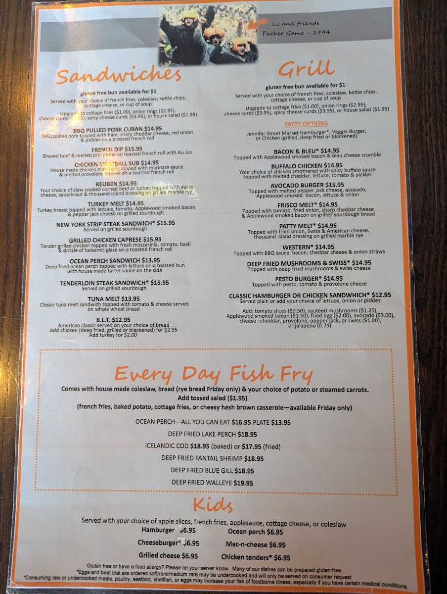 Guests can expect a selection of hearty options like the Classic Burger & Fries, Chicken Caprese Sandwich, and Deep Fried Perch Dinner, alongside lighter fare such as Shrimp Tacos and the Cuban Sandwich. The menu also features familiar sides, including crispy cheese curds and coleslaw, as well as gluten-free alternatives to accommodate different preferences.